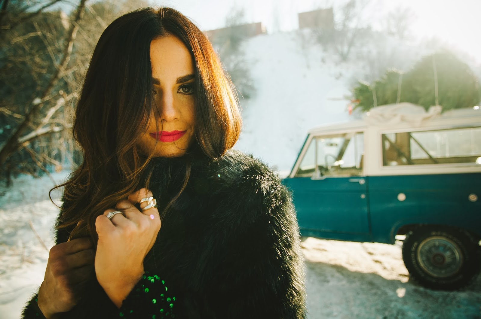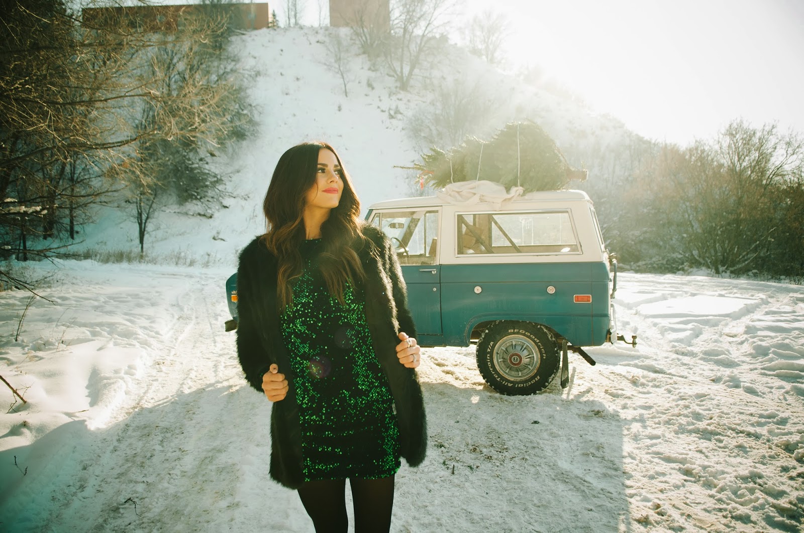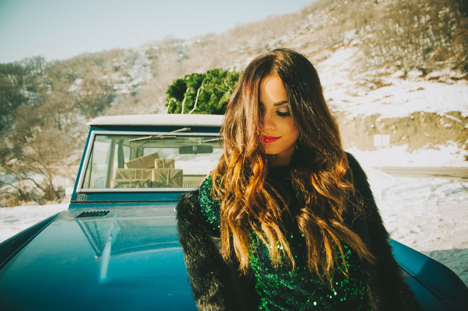 Gorgeous!! Love that dress, fur coat, vintage car, Christmas tree, ok I love everything about this post!