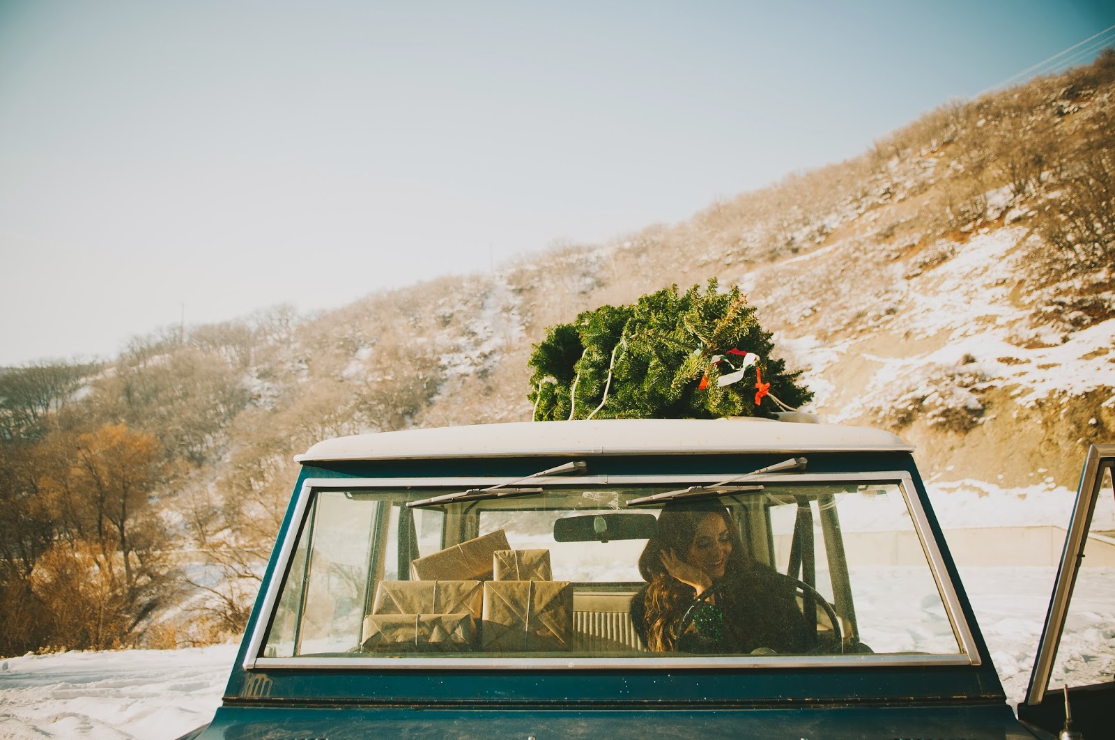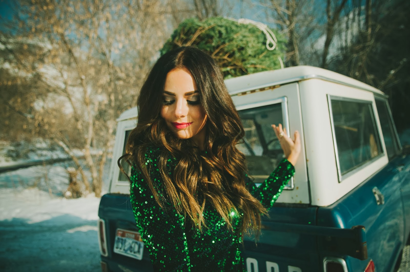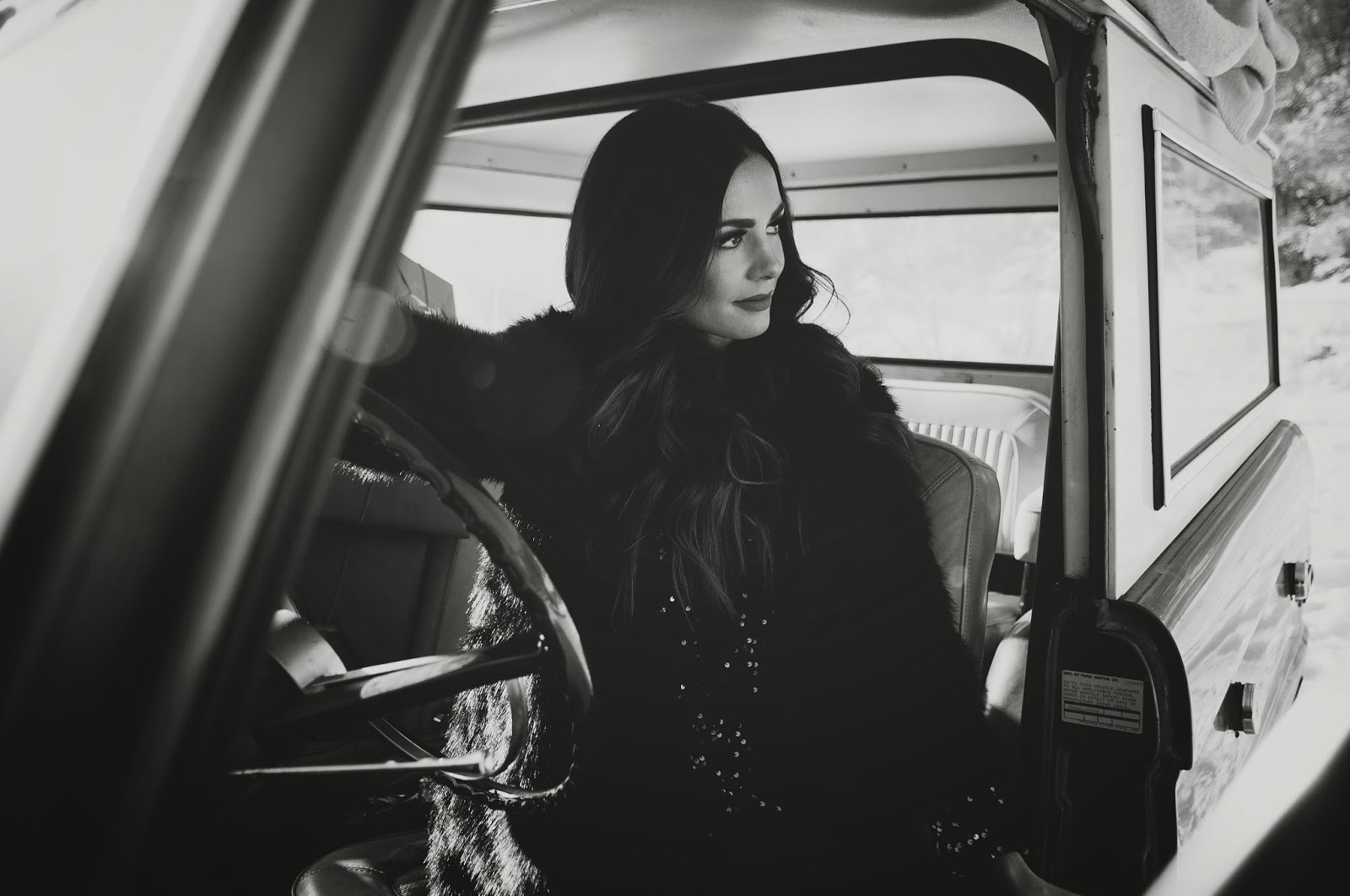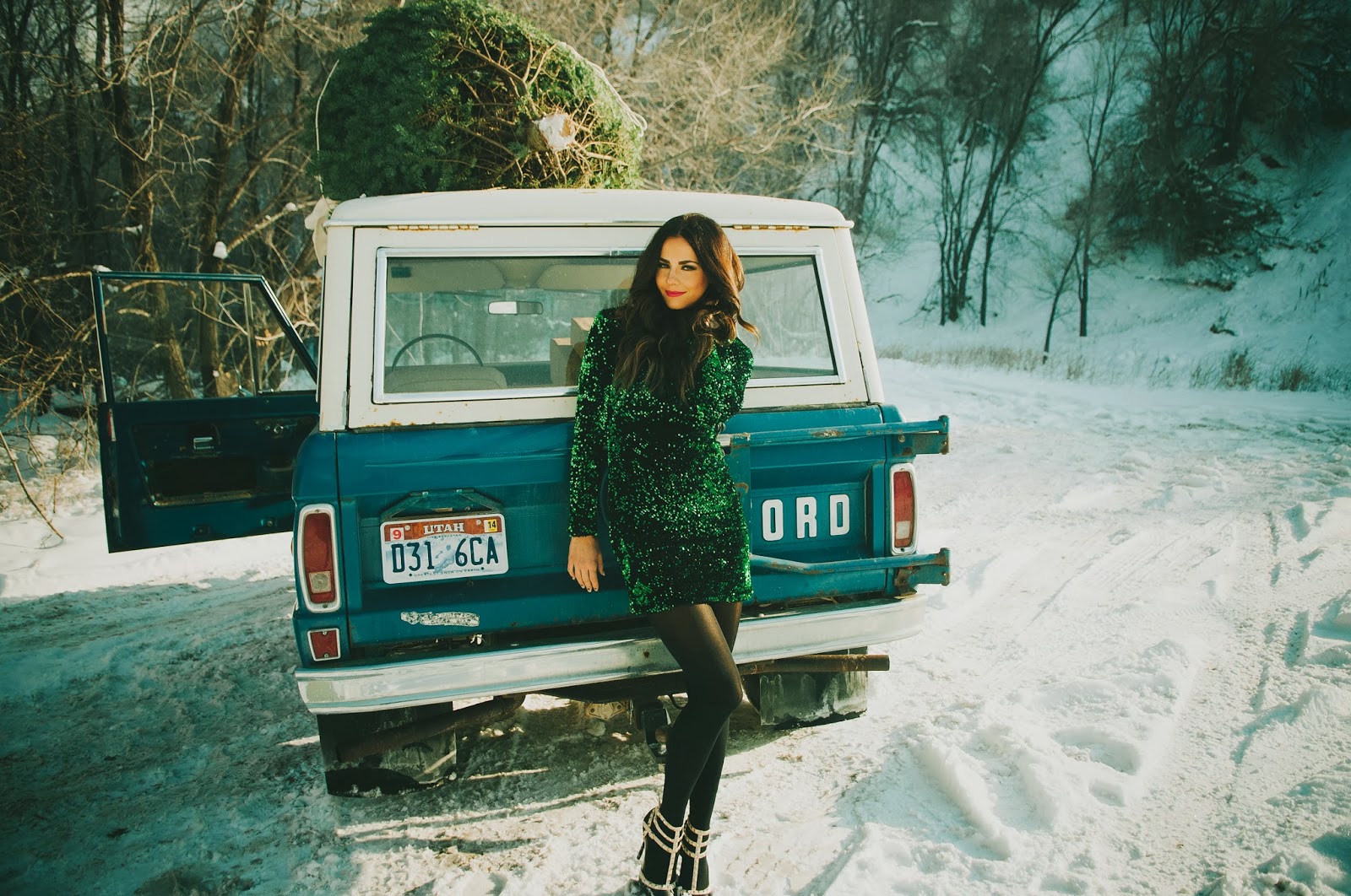 Gorgeous!! Love that dress, fur coat, vintage car, Christmas tree, ok I love everything about this post!