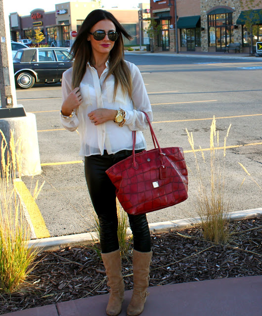 Top: Target {cute style here and here}| Bottoms: Esther Boutique {similar style here}| Boots: Fergie {old, but cute Fergie similar style here} | Purse: D&G {old, similar here} | Jewelry: Michael Kors, Cheerfully Charmed, Tjmaxx | Sunnies: Bohme | Lips: Mac (rebel)