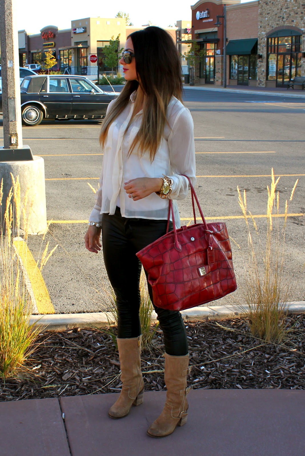 Top: Target {cute style here and here}| Bottoms: Esther Boutique {similar style here}| Boots: Fergie {old, but cute Fergie similar style here} | Purse: D&G {old, similar here} | Jewelry: Michael Kors, Cheerfully Charmed, Tjmaxx | Sunnies: Bohme | Lips: Mac (rebel)