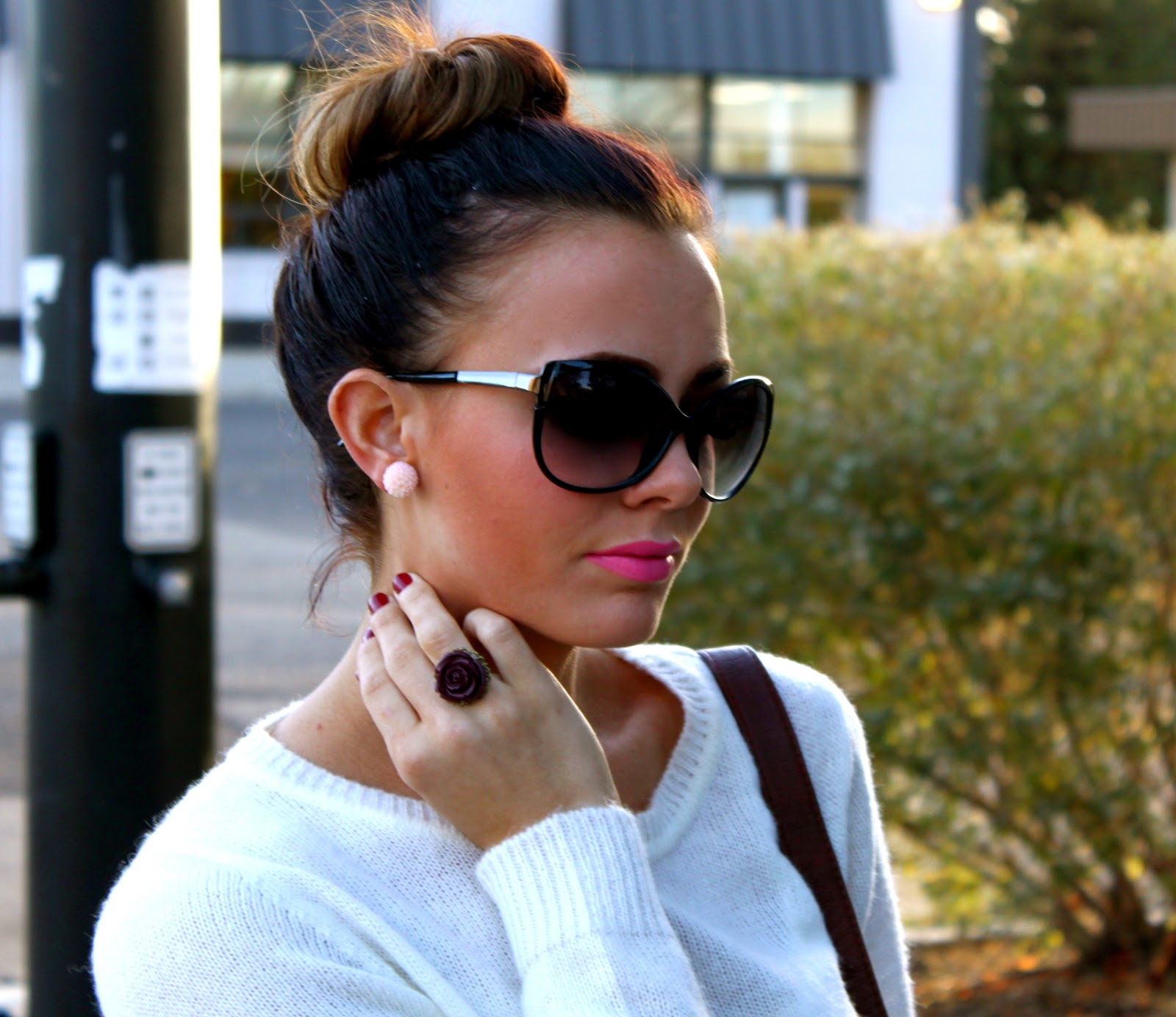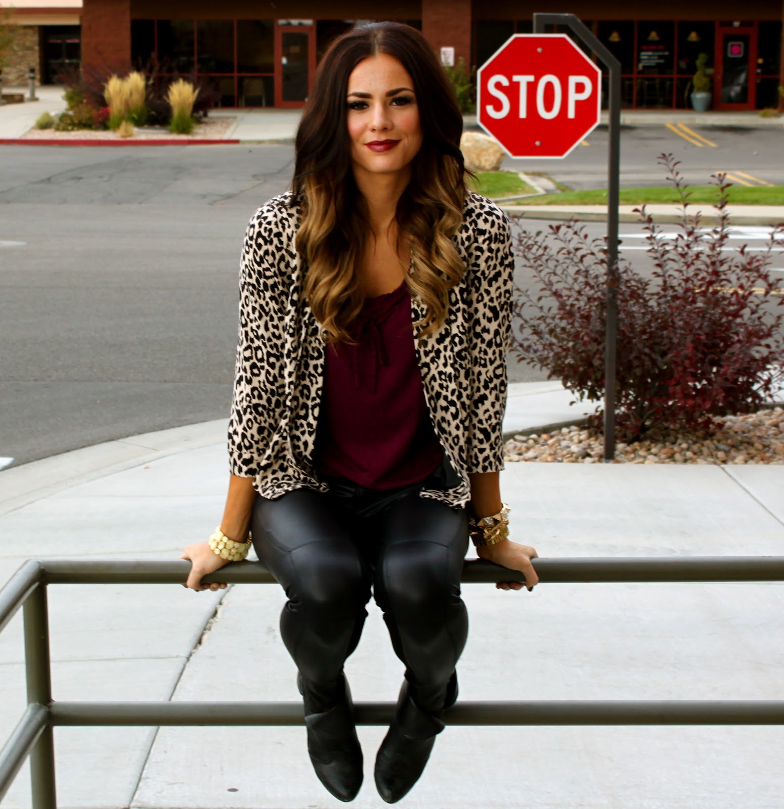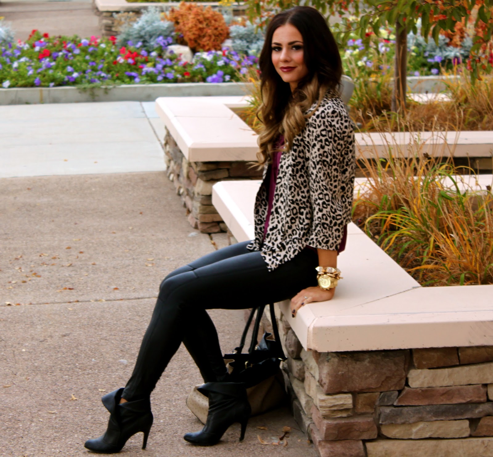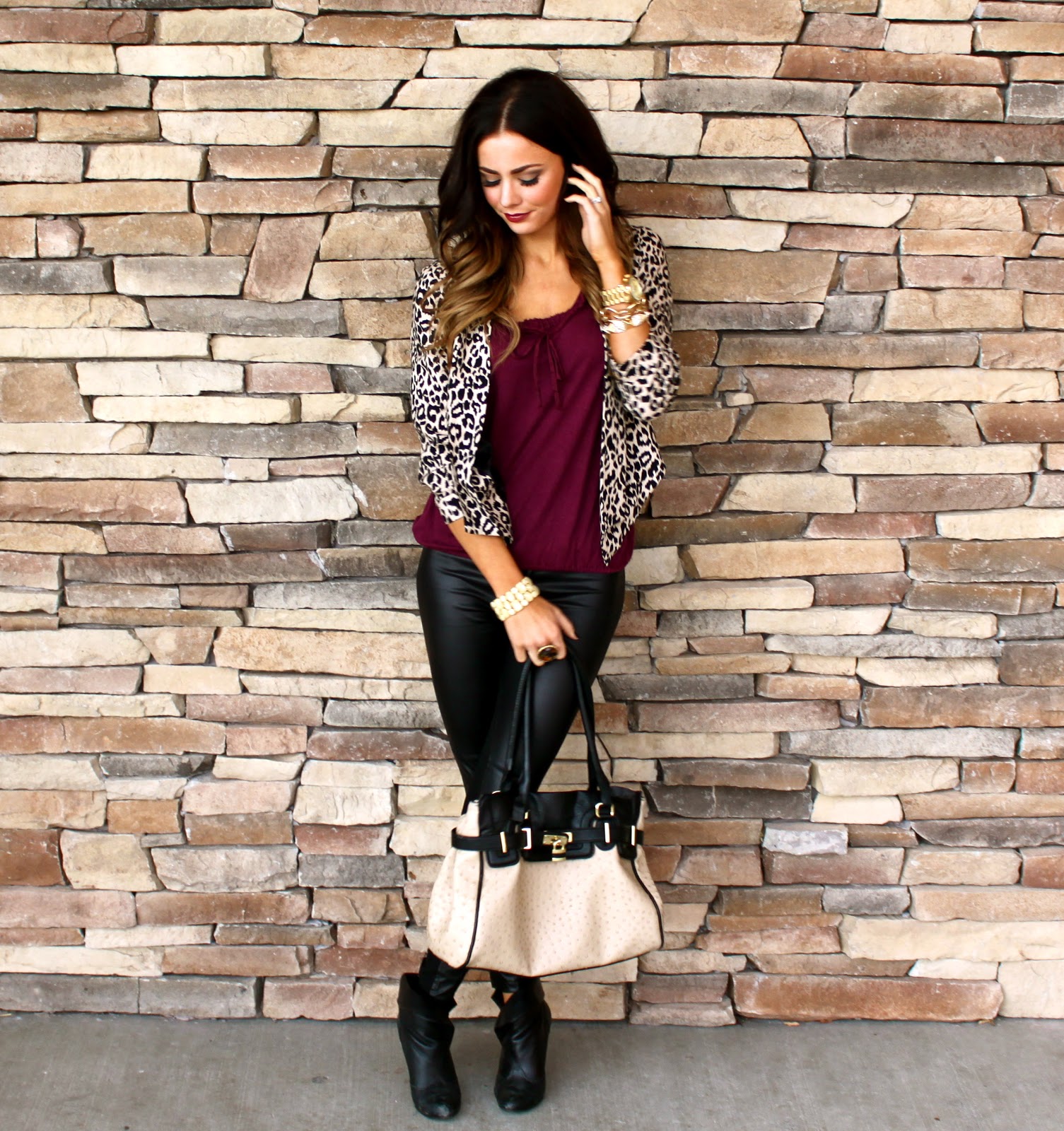 Top: Gap {Similar style here} | Bottoms: Esther Boutique | Jacket: Forever 21 {love this style here} | Shoes: Report {old, similar here} | Bag: Aldo | Jewelry: Michael Kors, Cheerfully Charmed, Forever 21 | Lips: Viva Glam 111 Mac.