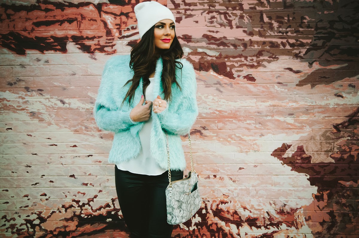 Loving these photos! That minty blue jacket is fab! Your makeup makes the look completely POP!