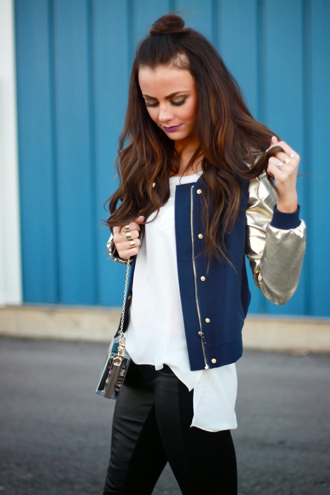 I was really hesitant on wearing these gold booties with the gold sleeves on the jacket, but I actually loved it.  I thought it might be a little to flashy, but it really compliments the bomber jacket more.  If you keep the accessories simple it will always work out.