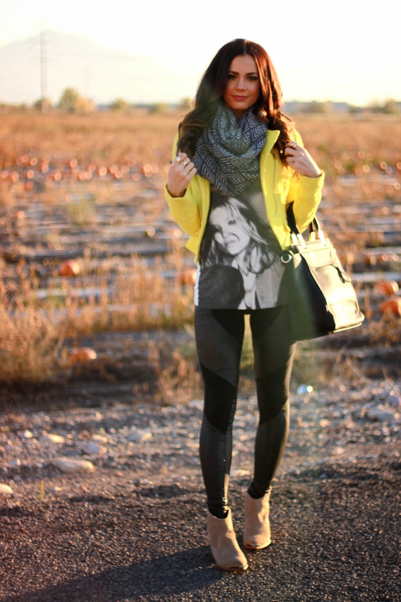 Those leggings look amazing on you! I love leather leggings—I have a pair from forever 21 (faux leather) that I would wear everyday if people wouldn’t ask questions! haha. That tee is so fun and the pop of yellow in your jacket is gorgeous!