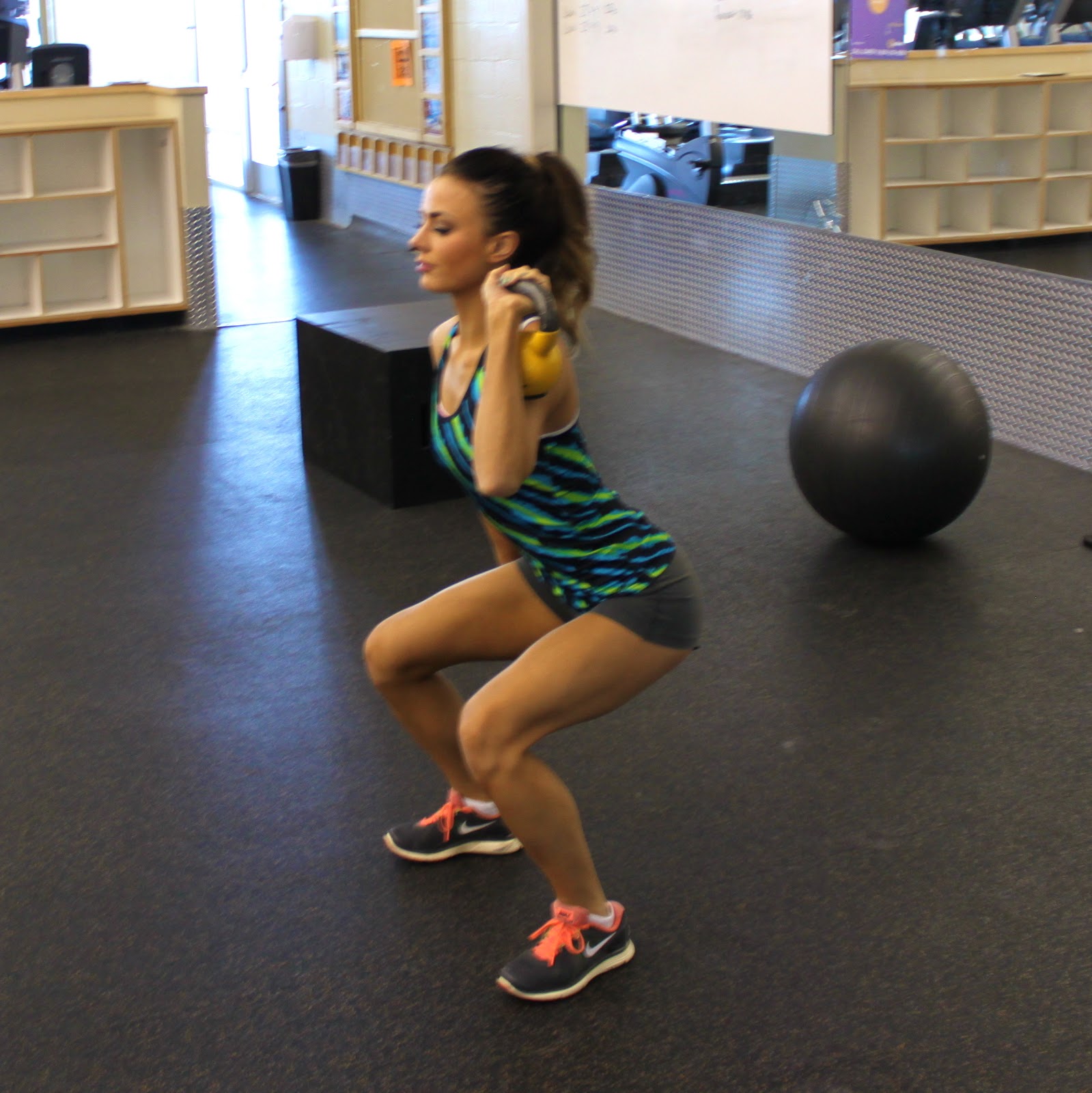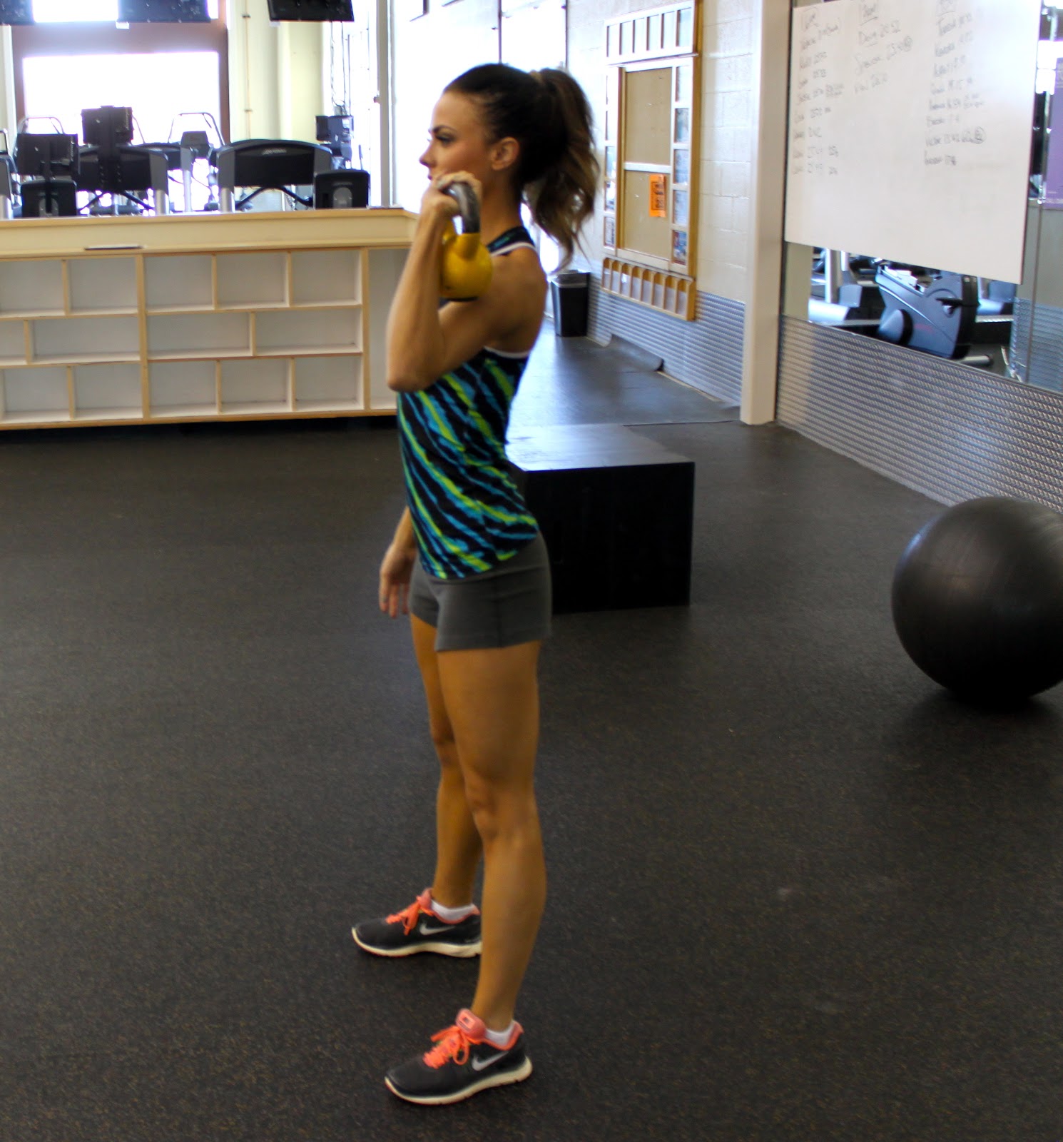 2. Use the same kettle bell and grab it like the first picture above over your shoulder. Then squat down as far as you can. From there raise your arm up as you are coming up from the squat like the third picture above. Continue this motion for 15-20 reps on each side.