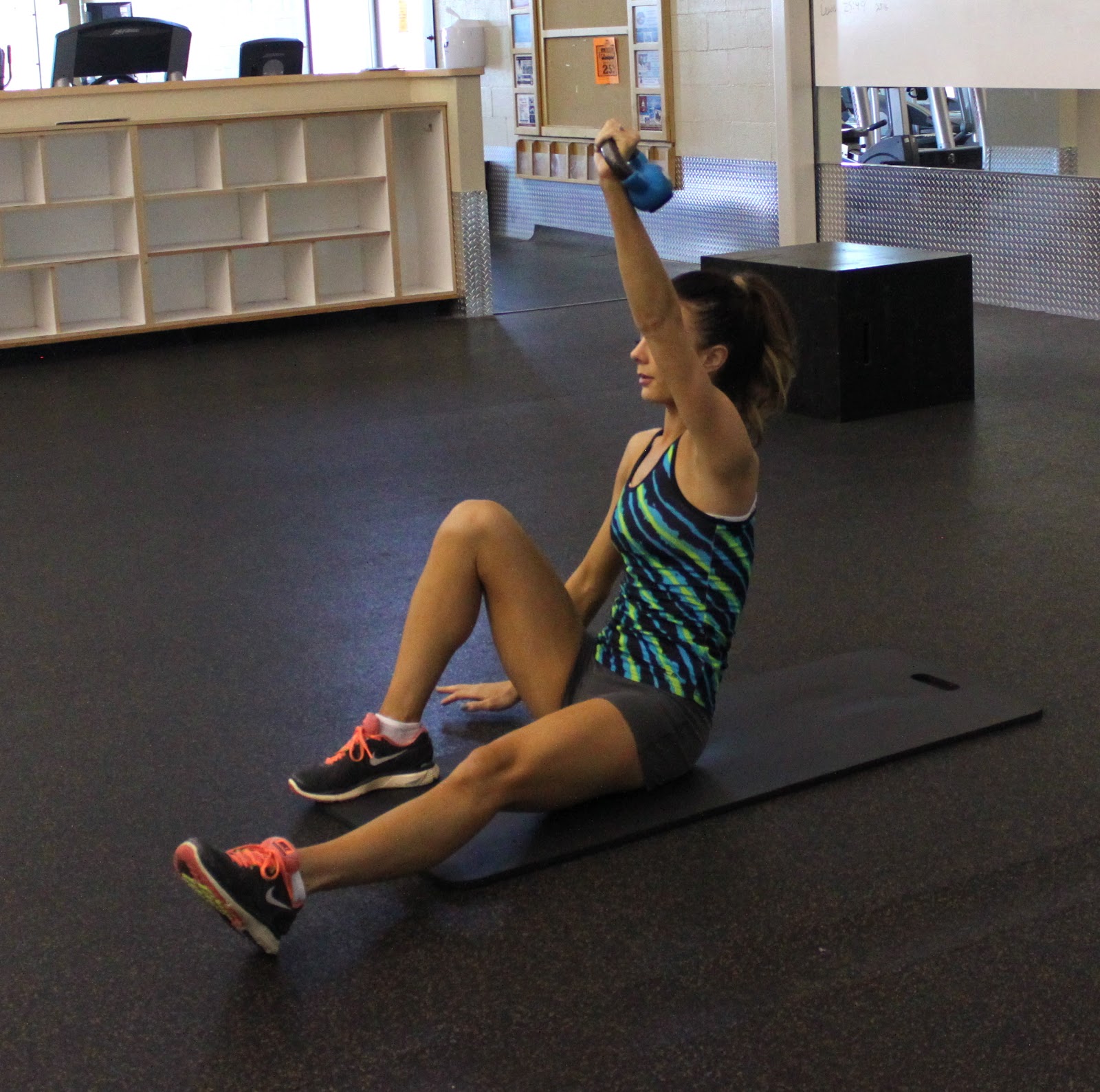 4. Grab a 5 pound or 10 pound kettle bell. Lay flat on your back and raise one arm up with the kettle bell in your hand, and lift the opposite leg up like the picture above. From there lift up and crunch towards the leg that is up. Continue this motion for 15-20 reps on each side.