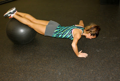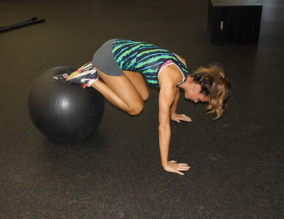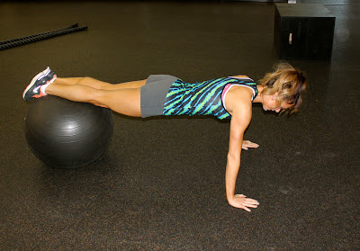 1. Grab an exercise ball and stand in a plank like the picture above with the exercise ball underneath your feet. From there you are going to bring your knees up to your chest and crunch and bring them back out and do a push up. Continue this motion for 20 reps.