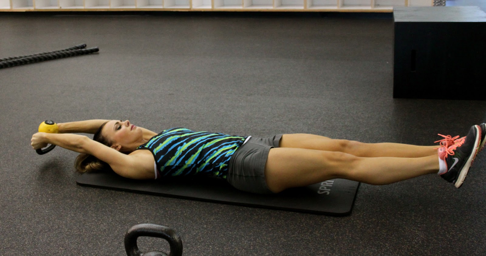 3. Grab a 5 pound kettle bell and hold it on both sides like the picture above. Reach up as far as you can crunching. Come back down and keeping your feet above the ground each rep. Continue doing this motion for 20 reps.